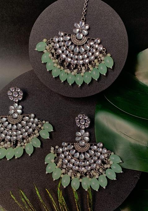 Ethnic Stylish Silver Oxidised Kundan Pearl Chandbali Earrings With Maang Tikka Set