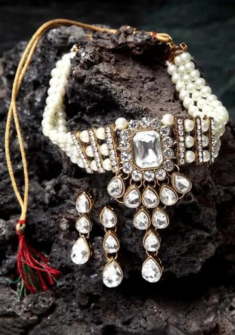 This Exclusive Style Pearl Choker Set With Classy Crystal Earrings Onesize White is thoughtfully crafted to elevate your style effortlessly—perfect for adding charm and elegance to your ethnic wardrobe.
