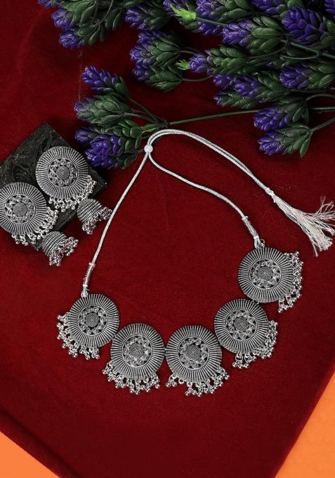 This Silver Oxidised Necklace Set With Maang Tikka is thoughtfully crafted to elevate your style effortlessly—perfect for adding charm and elegance to your ethnic wardrobe.